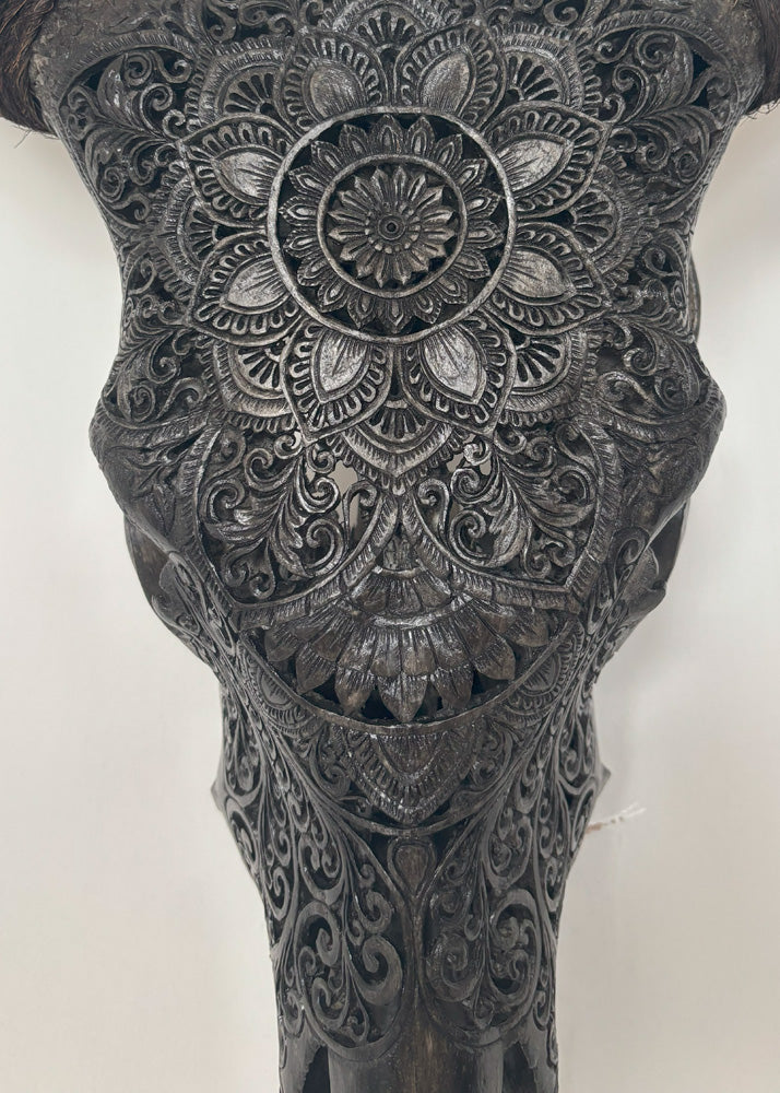 The authentic cow hand-carved skull is a stunning and rare item that will surely add a touch of unique beauty to any wall collection. The skull is ethically sourced and hand-carved ,making each piece one-of-a-kind. This exquisite work of art is a true testament to the skill and craftsmanship of the artist who created it. Don't miss out on the opportunity to own such a remarkable piece.