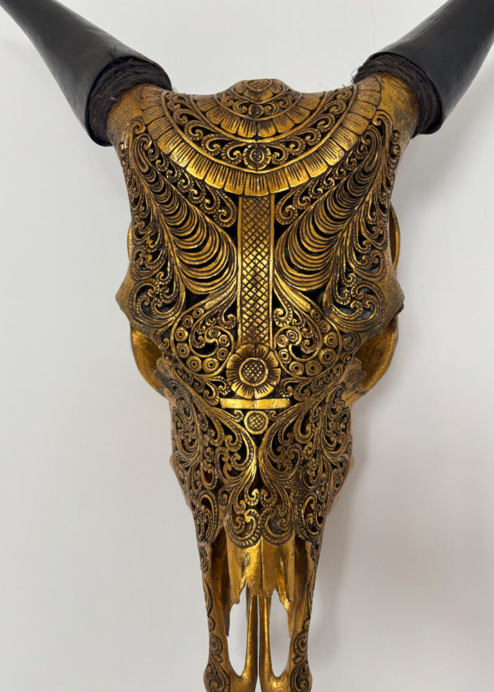 The authentic cow hand-carved skull is a stunning and rare item that will surely add a touch of unique beauty to any wall collection. The skull is ethically sourced and hand-carved ,making each piece one-of-a-kind. This exquisite work of art is a true testament to the skill and craftsmanship of the artist who created it. Don't miss out on the opportunity to own such a remarkable piece.