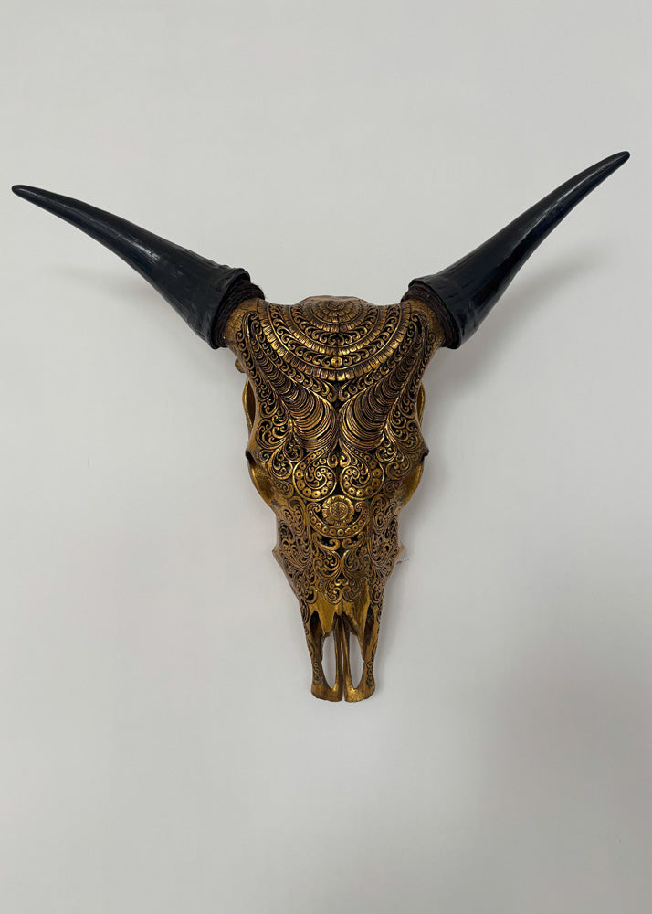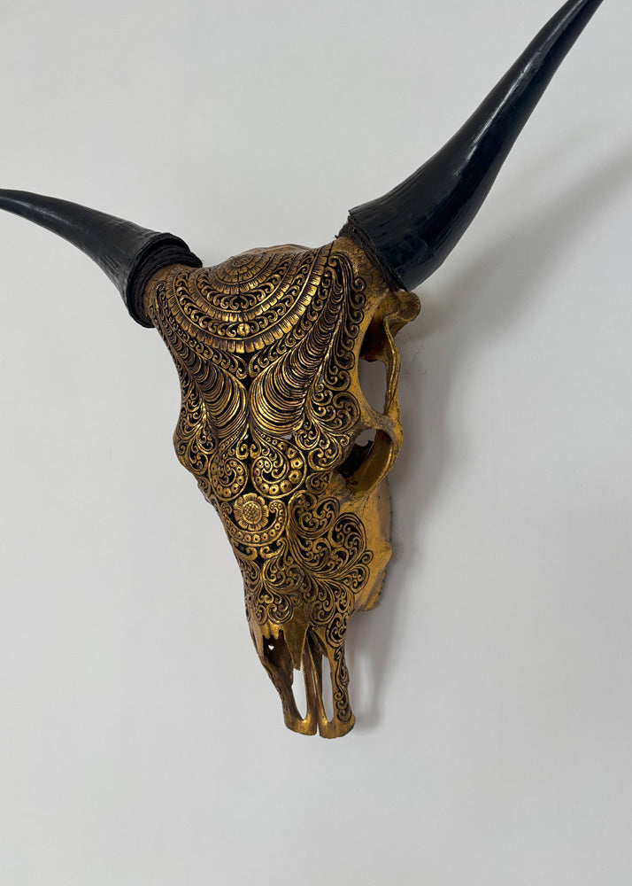 The authentic cow hand-carved skull is a stunning and rare item that will surely add a touch of unique beauty to any wall collection. The skull is ethically sourced and hand-carved ,making each piece one-of-a-kind. This exquisite work of art is a true testament to the skill and craftsmanship of the artist who created it. Don't miss out on the opportunity to own such a remarkable piece.