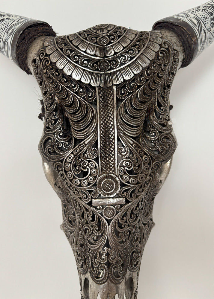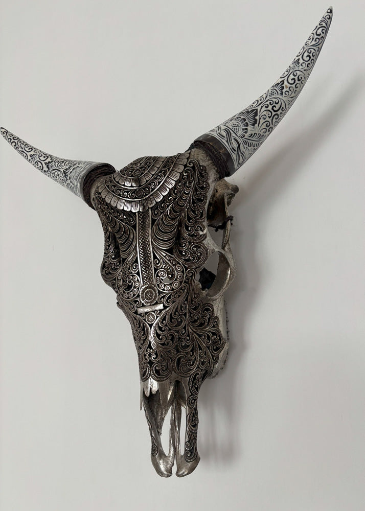 The authentic cow hand-carved skull is a stunning and rare item that will surely add a touch of unique beauty to any wall collection. The skull is ethically sourced and hand-carved ,making each piece one-of-a-kind. This exquisite work of art is a true testament to the skill and craftsmanship of the artist who created it. Don't miss out on the opportunity to own such a remarkable piece.