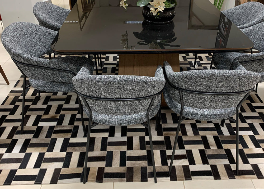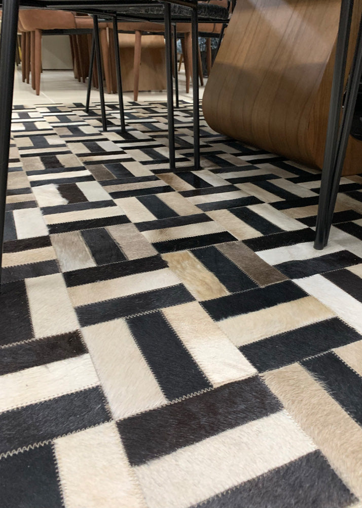 A beige and black patchwork cowhide rug laid out on a floor, with a dining table and chairs set on top of it.