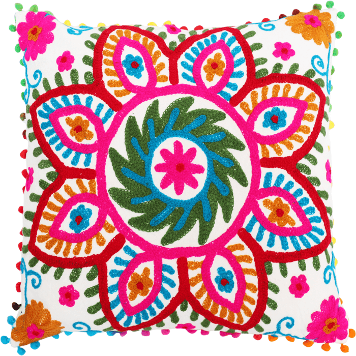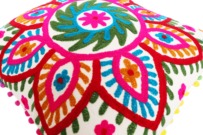 High-quality material and durability make this cushion cover an obvious choice for your living space. Made from 100% Pure Cotton, it boasts of Suzani Hand embroidery and hand wool embroidery. It also consists of pom detailing. It has a size of 45 x 45 CM and has a zip closure at the back. Hand wash it in cold water with mild/liquid detergent is recommended. Buy this cushion cover while the stock lasts.