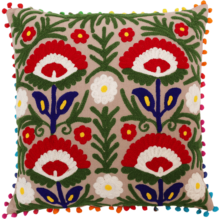 The style is what defines this cushion cover which is made with 100% Pure Cotton and adorned with Suzani Hand embroidery and hand wool embroidery. It also has pom detailing on it. It comes with a cushion filler with it and its size is 45 x 45 CM. It has a zip closure at the back. Hand wash it in cold water with mild/liquid detergent recommended.