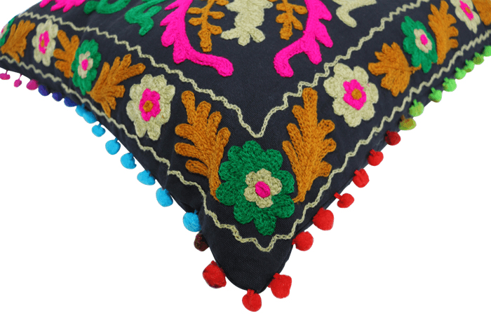 Add a new look to your living room with this colourful cushion cover. It is made from 100 % Pure Cotton and decorated with beautiful Suzani Hand embroidery, hand wool embroidery and pom poms. Its size is 45 x 45 CM and cushion filler comes along with it. It also has a zip closure at the back which makes it easy to use. Hand wash it in cold water with mild/liquid detergent is recommended.