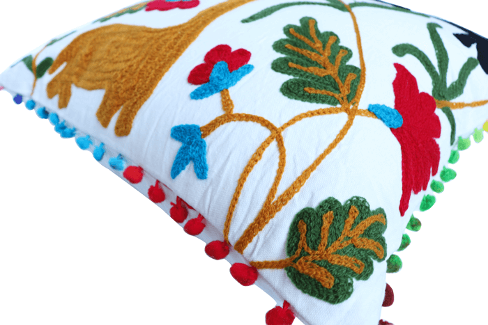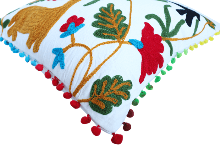 This charming cushion cover is perfect for your room if you want a lively look and feel. It is made with 100% Pure Cotton and has Suzani Hand embroidery, hand wool embroidery and pom pom detailing on it. It is of high quality and has a size of 45 x 45 CM. It has a zip closure at the back and it comes with a cushion filler. Buy it now before the stock finishes. Hand wash it in cold water with mild/liquid detergent recommended.