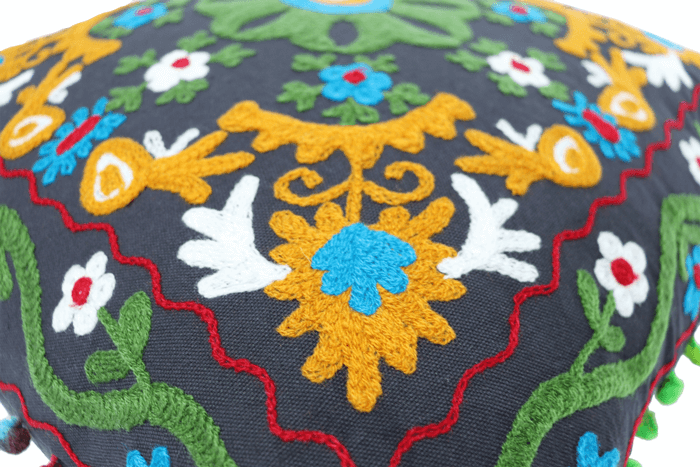 This colourful cushion cover with Suzani Hand embroidery and hand wool embroidery and pom pom detailing can match beautifully with any theme of every home. So just pick it up for any room in your home. This cushion cover is made with 100% Pure Cotton and comes with a cushion filler. Its size is 45 x 45 CM and has a zip closure at the back. Hand wash it in cold water with mild/liquid detergent recommended.