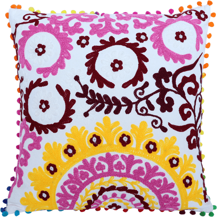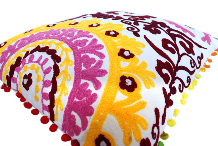This cushion cover is beautifully designed with Suzani Hand embroidery and hand wool embroidery and pom pom detailing. It is made with 100% Pure Cotton. It has a zip closure at the back and its size is 45x 45 CM. Cushion filler is included with this piece. So just pick it up and make it a part of your room. Hand wash it in cold water with mild/liquid detergent recommended.