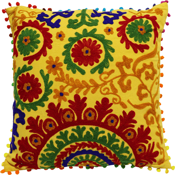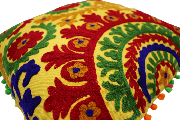 With an attractive combination of red and yellow, this colourful cushion cover is sure to add life to your room. It is made with 100% Pure Cotton and has Suzani Hand embroidery, hand wool embroidery and pom poms detailing on it. Its size is 45 x 45 CM and it comes with a zip closure at the back. It also includes a cushion filler with it. Hand wash it in cold water with mild/liquid detergent is recommended.