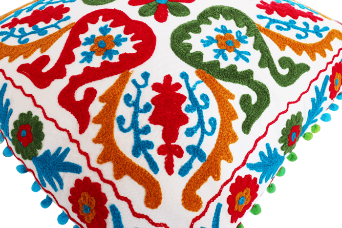 This bright and colourful cushion cover made with 100% Pure Cotton will surely attract the attention of your guests. It has Suzani Hand embroidery, hand wool embroidery and pom poms detailing on it which brings charm to it. Its size is 45 x 45 CM. It has a zip closure at the back and it comes with a cushion filler. Hand wash it in cold water with mild/liquid detergent recommended.