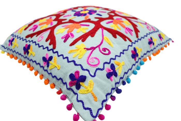 This bright cushion cover with floral design is of excellent finish and finest quality as it is made with 100% Pure Cotton. Its beauty lies in its Suzani Hand embroidery, hand wool embroidery and pom poms detailing. It will surely add a touch of grace to your living space. Its size is 45 x 45 CM and it includes a cushion filler with it. It also comes with a zip closure at the back. Hand wash it in cold water with mild/liquid detergent is recommended.