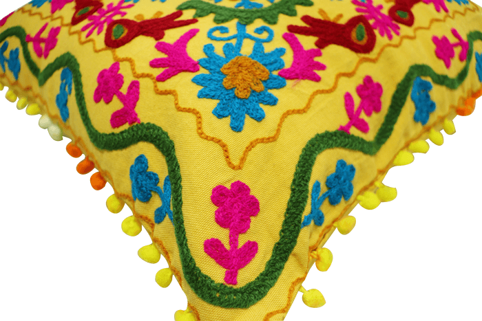 Use this cushion cover daily or for a special occasion and you are sure to get compliments from your guests. It is made from 100 % Pure Cotton. It has attractive Suzani Hand embroidery, hand wool embroidery and pom poms detailing. Its size is 45 x 45 CM and has a zip closure at the back. It comes with a cushion filler. Hand wash it in cold water with mild/liquid detergent recommended.
