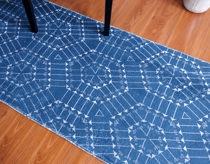 This machine-made/power-loomed rug will surely add some style to your living room. It is made of polyester and vegetable-dyed colours are used. It is a heat-set printed rug so the colour never fades and is super soft. This is a good quality affordable rug.