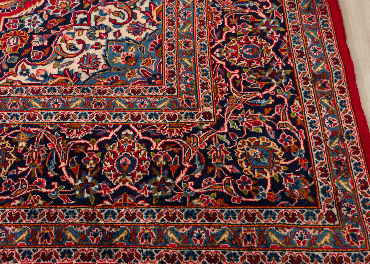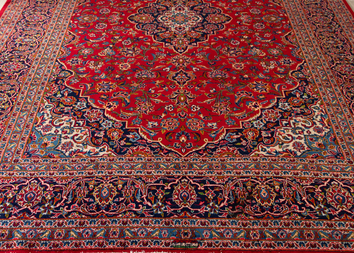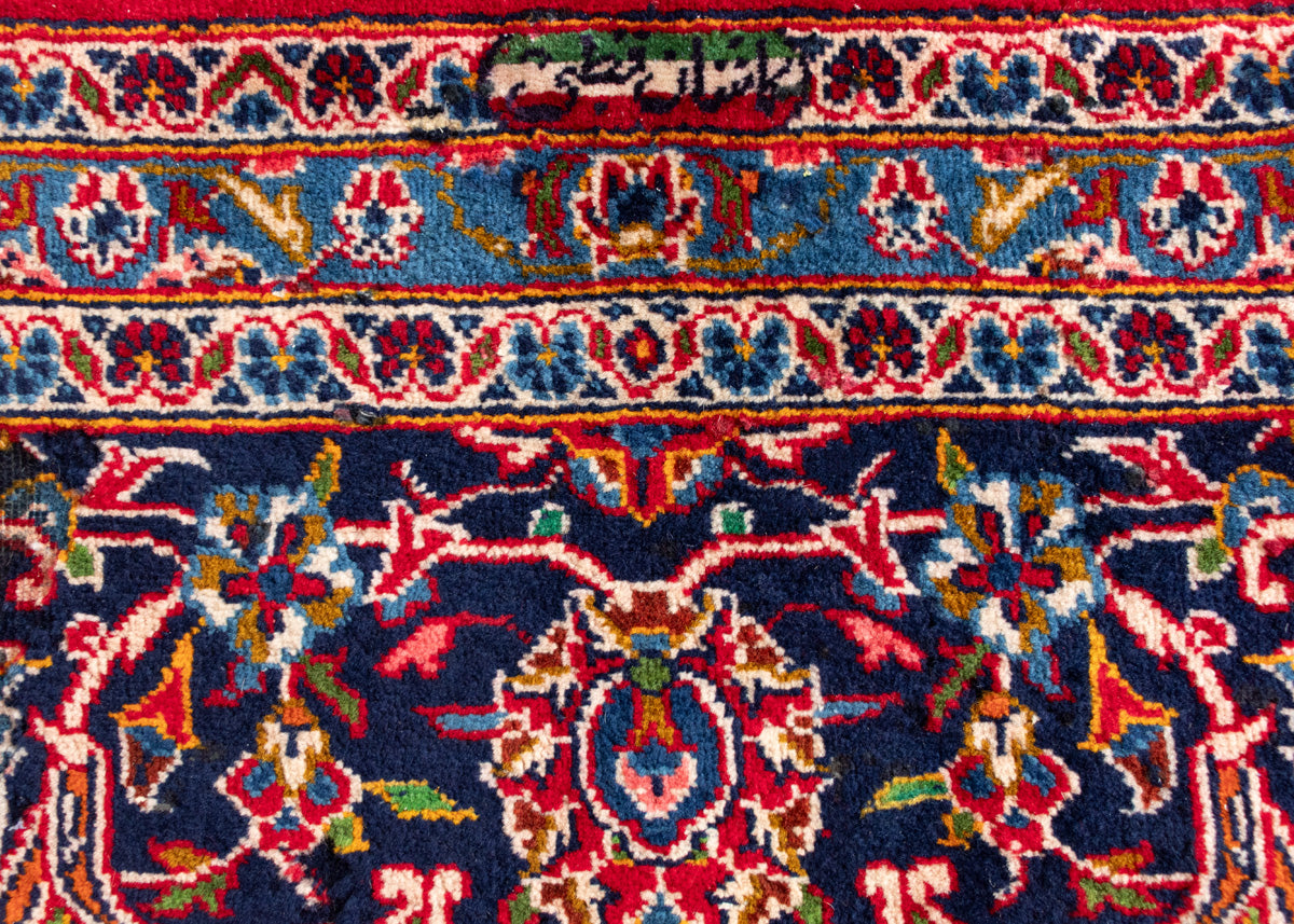 One of the best quality vintage signed rug by the weaver. Kashan rugs are originated from Kashan an oasis town along the Kavir desert in central Iran. It is the oldest and one the best carpet producer city in Iran. Kashan carpets are extremely fine quality and dense knots rugs which are famous all over the world. Kashan Carpets are mainly in a red medallion with a blue colour combination. These designs usually use flowers, leaf and other motifs.