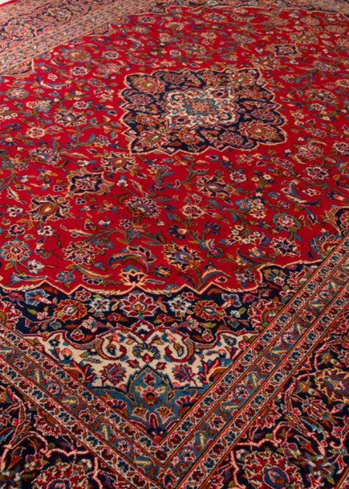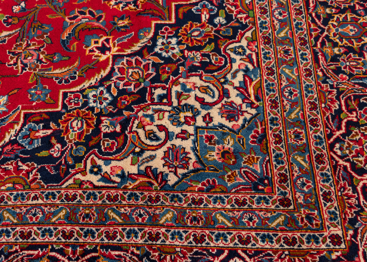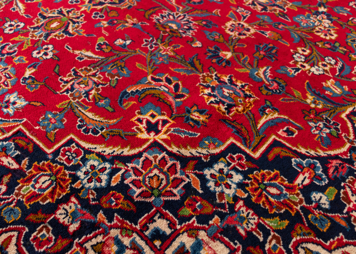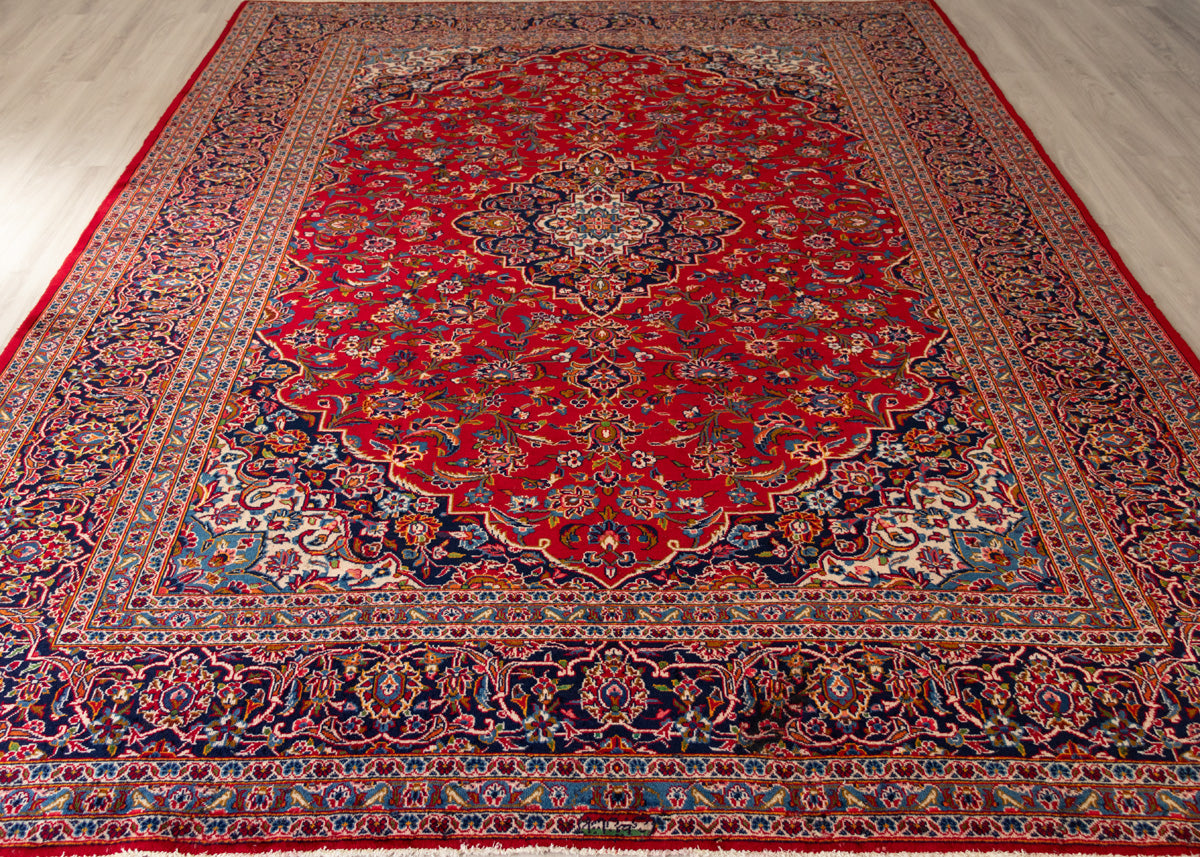 One of the best quality vintage signed rug by the weaver. Kashan rugs are originated from Kashan an oasis town along the Kavir desert in central Iran. It is the oldest and one the best carpet producer city in Iran. Kashan carpets are extremely fine quality and dense knots rugs which are famous all over the world. Kashan Carpets are mainly in a red medallion with a blue colour combination. These designs usually use flowers, leaf and other motifs.