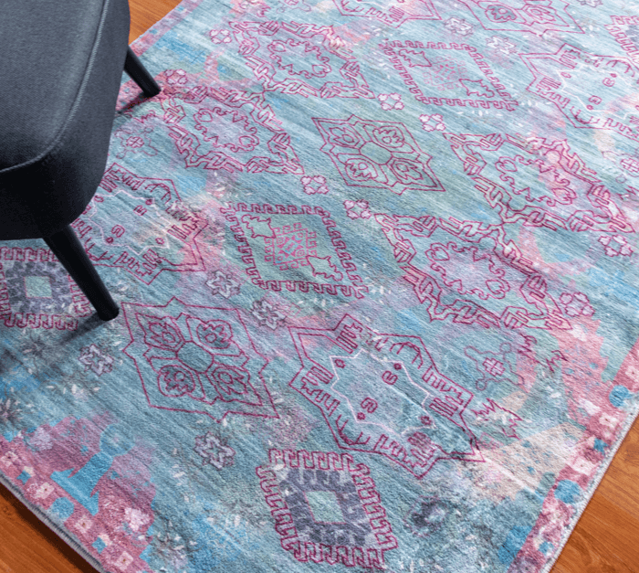 This tribal-style machine-made/power-loomed rug will surely add some style to your living room. It is made of polyester and vegetable dyed colours are used. It is a heat-set printed rug so the colour never fades and is super soft. This is a good quality affordable rug.