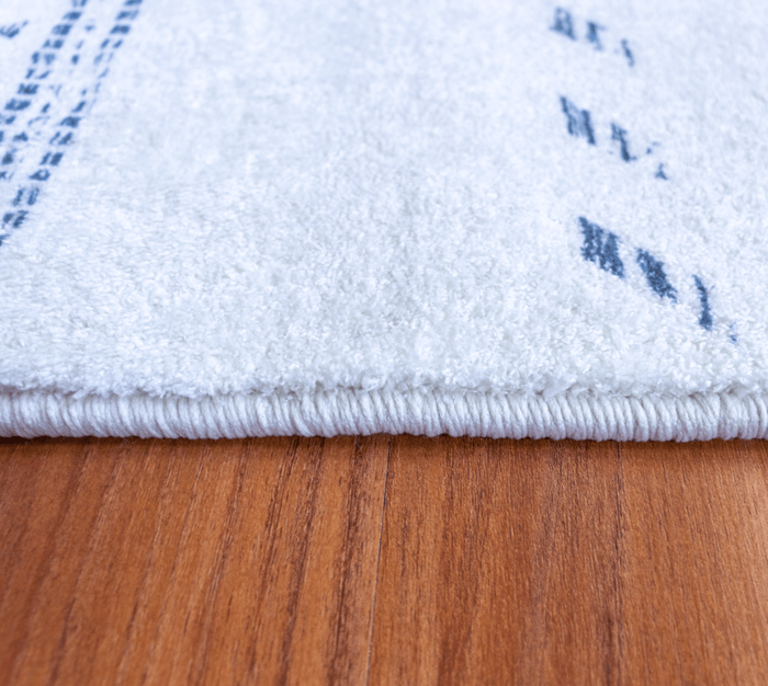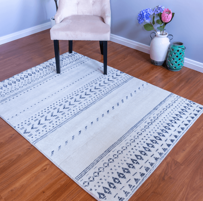 This tribal-style machine-made/power-loomed rug will surely add some style to your living room. It is made of polyester and vegetable dyed colours are used. It is a heat-set printed rug so the colour never fades and is super soft. This is a good quality affordable rug.