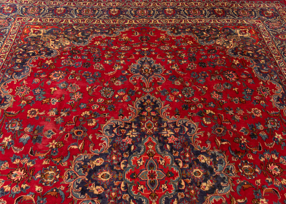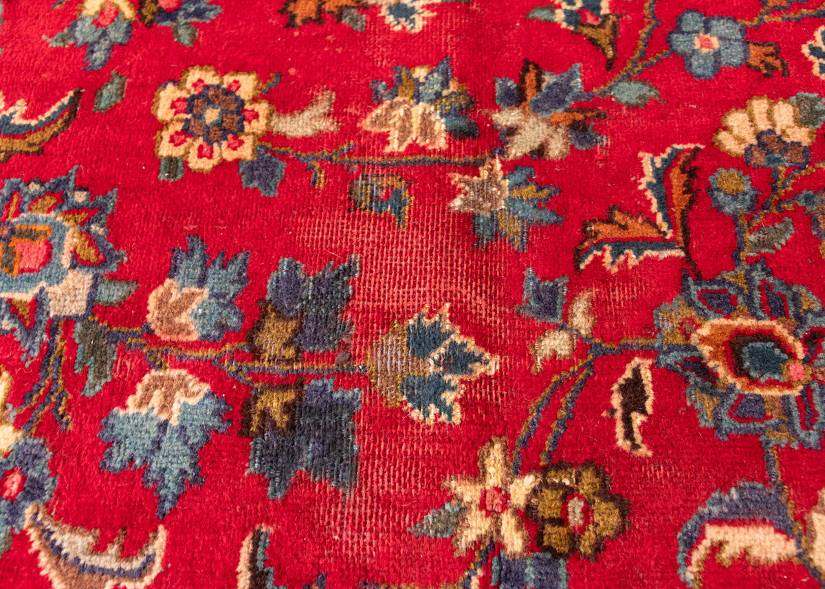 This is a lovely piece of art rug in reddish colours. Mashad rugs are originated from Mashhad city which is located Khorasan province of northeastern Iran. Mashhad is the ancient city of Khorasan, and it was the capital of Khorasan province. It is a holy place and destination for pilgrims. Mashad hand-knotted rugs in the sixteenth to eighteenth have floral designs with beautiful colour combinations. Mashad carpets colouration background generally in red-blue or pomegranate-red. Normally in the designs used palmettes, flowers, leaves, vines, stylized motifs, and minor borders.
