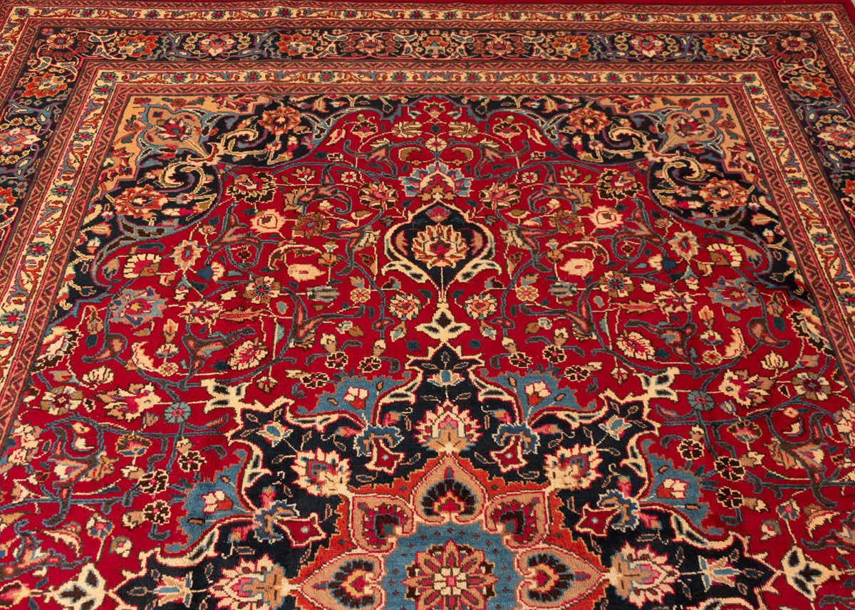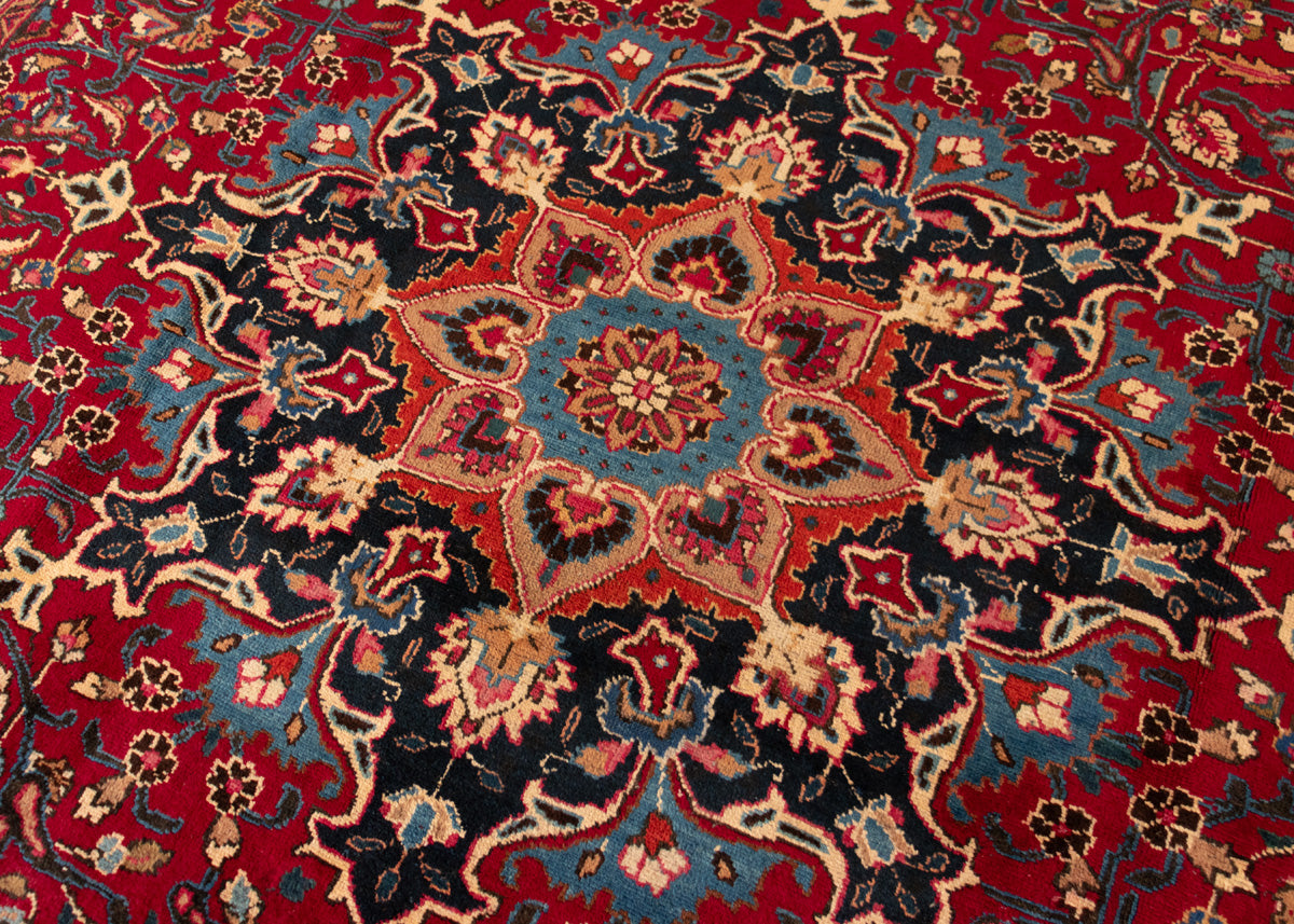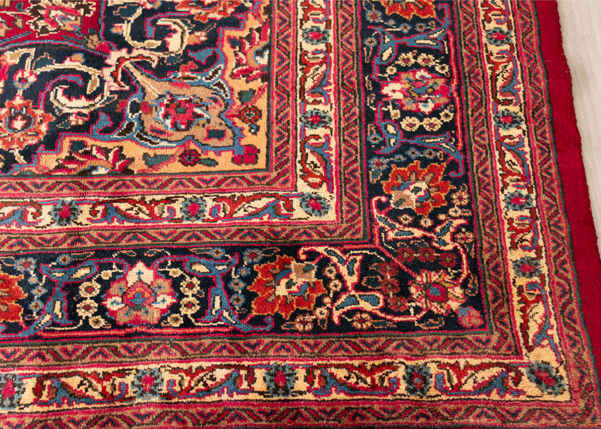 This is a rare rug in reddish colours with a floral design. Mashad rugs are originated from Mashhad city which is located Khorasan province of northeastern Iran. Mashhad is the ancient city of Khorasan, and it was the capital of Khorasan province. It is a holy place and destination for pilgrims. Mashad hand-knotted rugs in the sixteenth to eighteenth have floral designs with beautiful colour combinations. Mashad carpets colouration background generally in red-blue or pomegranate-red. Normally in the designs used palmettes, flowers, leaves, vines, stylized motifs, and minor borders.