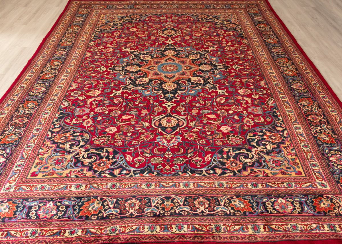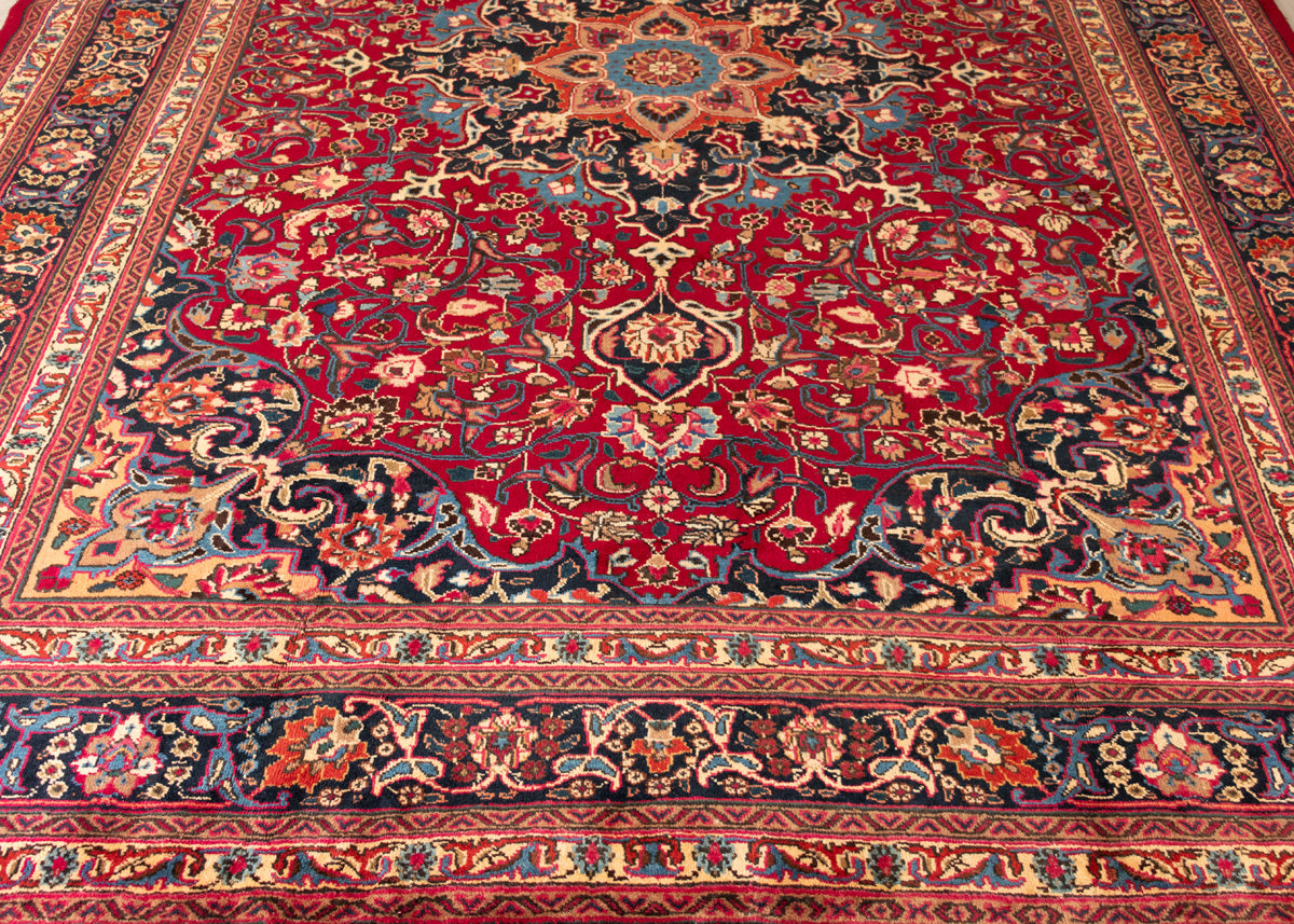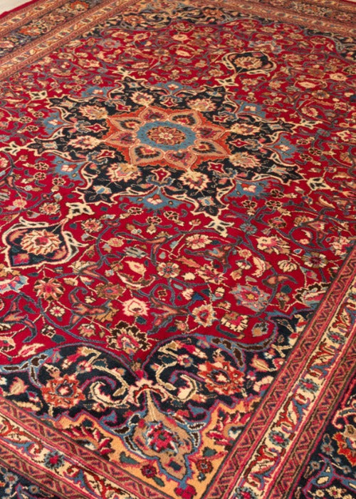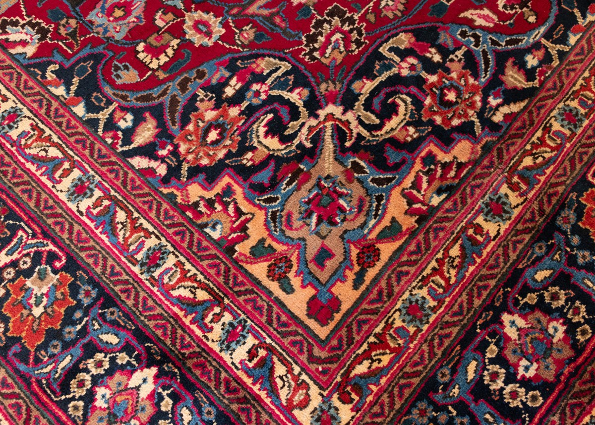 This is a rare rug in reddish colours with a floral design. Mashad rugs are originated from Mashhad city which is located Khorasan province of northeastern Iran. Mashhad is the ancient city of Khorasan, and it was the capital of Khorasan province. It is a holy place and destination for pilgrims. Mashad hand-knotted rugs in the sixteenth to eighteenth have floral designs with beautiful colour combinations. Mashad carpets colouration background generally in red-blue or pomegranate-red. Normally in the designs used palmettes, flowers, leaves, vines, stylized motifs, and minor borders.