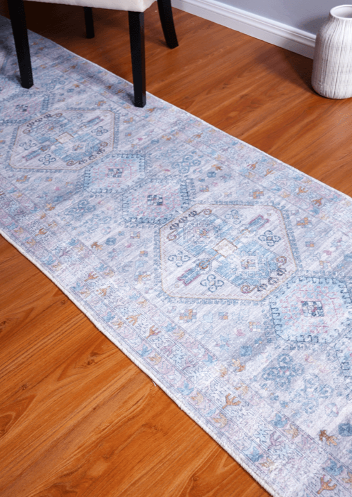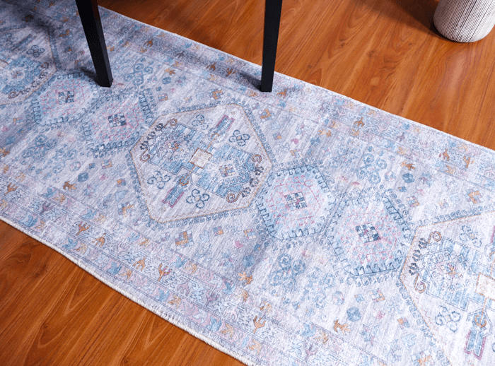 This vintage-style machine-made/power-loomed rug will surely add some style to your living room. It is made of polyester and vegetable dyed colours are used. It is a heat-set printed rug so the colour never fades and is super soft. This is a good quality affordable runner rug.