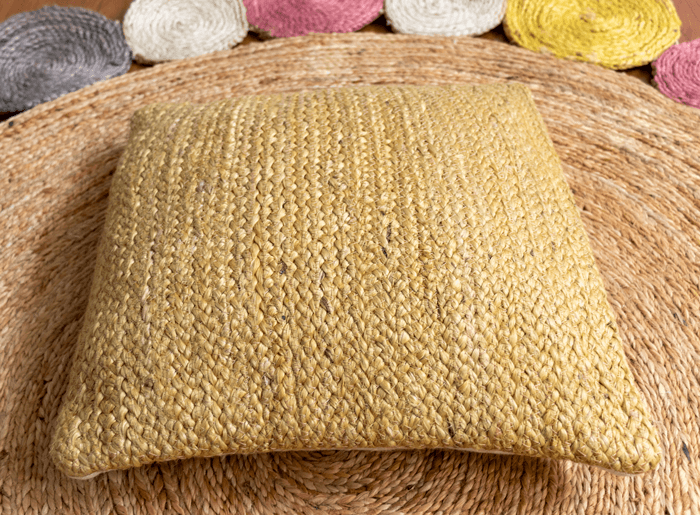 This jute cushion cover is made with natural fibre and dyed using natural colours. It is handmade/hand-loomed and the size is 45 x 45 CM with cotton zip backing. It includes a cushion filler with it. It is of the finest quality.
